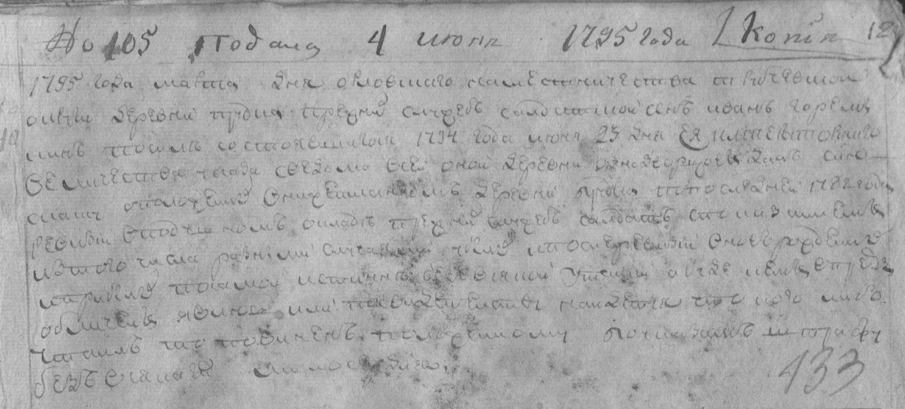 1795 года марта дня орловскаго наместничества трубчевской округи деревни прудки прежних служеб салдатской сын иван горемыкин по силе состоящаго 1794 года июня 23 дня ея императаторскаго величества указа сведома всей оной деревни однодворцовых дал сию скаску оположенных в нижеписаной деревни прудки и по последней 1785 года ревизии в подушном окладе прежних служеб салдат споказанием из того числа разными случаями убылых и после ревизии вновь рожденных и прибылых посамой истинне без всякой утайки а буде кем впредь обличен явлюсь или посвидетельству ... что кого либо утаил то повинен положенному по указу ... штрафу без всякого милосердия