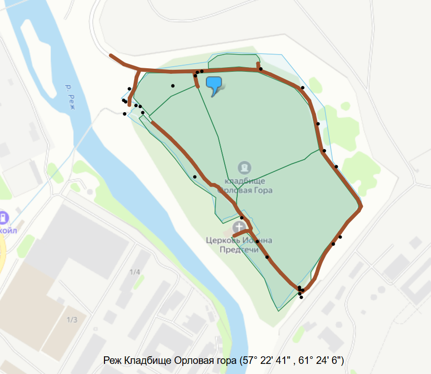 Историческое городское кладбище "Орлова гора" начало своё существование, видимо, вместе с Режевским заводом. Жители выбрали под погост самое возвышенное место возле посёлка – гору Сухую или по-другому Орлову. Там же существовала неизвестно с какого времени (но к 1801 г. уже была) православная часовня. Затем была построена деревянная церковь Иоанна Предтечи. Её метрические книги известны с 1830 года. К 1902 г. на её месте построен каменный кладбищенский храм. Он был закрыт при советской власти и подвергся осквернению. Но вот уже третий десяток лет снова является действующим. Храм является украшением города. А погост, хоть и является формально закрытым, до сих пор используется под родственные захоронения. Режевские родоведы начали описание кладбища несколько лет назад. К настоящему времени описано более 13000 захоронений. В этой теме будут опубликованы списки некрополя. Увидев заинтересовавшее Вас имя, можете обратиться ко мне за подробностями. Я подскажу даты жизни. В большинстве случаев выложу фото.